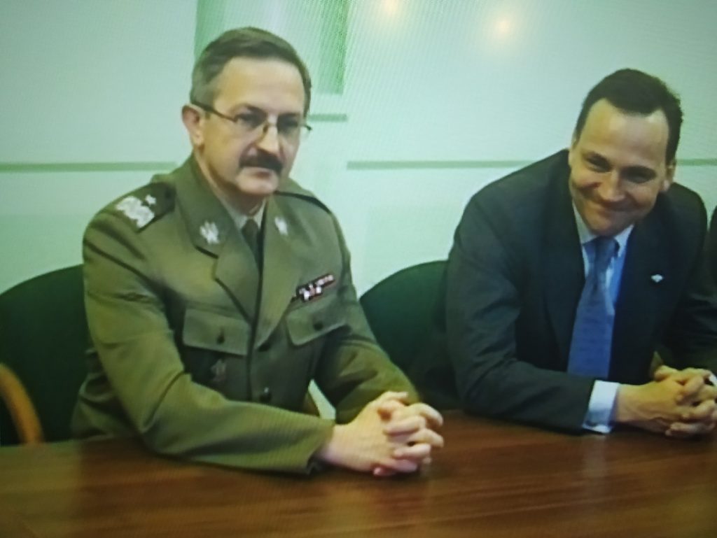 Zdjęcie przedstawia standardowo uśmiechniętego Radosława Sikorskiego, wtedy Ministra Obrony Narodowej w towarzystwie gen. bryg. dr. Adama Sowy wizytujących 7 stycznia 2007 r. naszą Akademię. W trakcie tej wizyty został pozbawiony pełnienia swojej funkcji będący Rektorem WAT gen. bryg. prof. dr hab. inż. Bogusław Smulski, a na jego miejsce wyznaczony siedzący przy ministrze gen. bryg. dr A. Sowa.